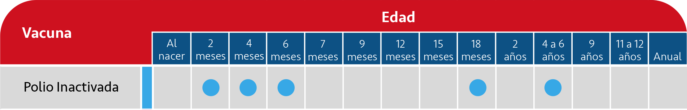 La vacuna de virus inactivados, VPI o Salk se aplica a los dos, cuatro, seis meses de edad con revacunación a los 18 meses y entre los 4 y 6 años de edad.
