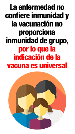 La enfermedad no confiere inmunidad y la vacunación no proporciona inmunidad de grupo, por lo que la indicación de la vacuna es universal.