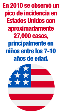 Entre 2001-2003 se reportó en Estados Unidos la tasa de incidencia más elevada de tos ferina entre los niños menores de un año (55.2 casos por 100,000 habitantes), y especialmente entre menores de 6 meses (98.2 casos por 100,000 habitantes). También se han reportado elevaciones en la incidencia de casos en adolecentes y adultos de 5.5 casos por 100,000 habitantes en 2001 a 10.9 casos por 100,000 habitantes en 2003. En 2010 se observó otro pico de incidencia en Estados Unidos con aproximadamente 27,000 casos, principalmente en niños entre los 7-10 años de edad.